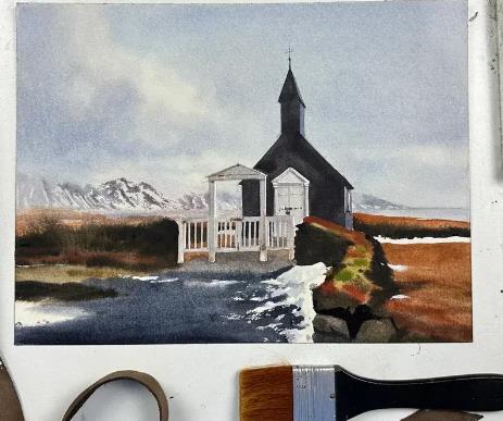 Пишем высокогорный храм и учимся показывать разнообразные природные фактуры — облака, траву, камень. Работаем сначала по-мокрому, смачивая лист с двух сторон, а затем прорабатываем детали и расставляем финальные акценты сухой тонкой кистью.